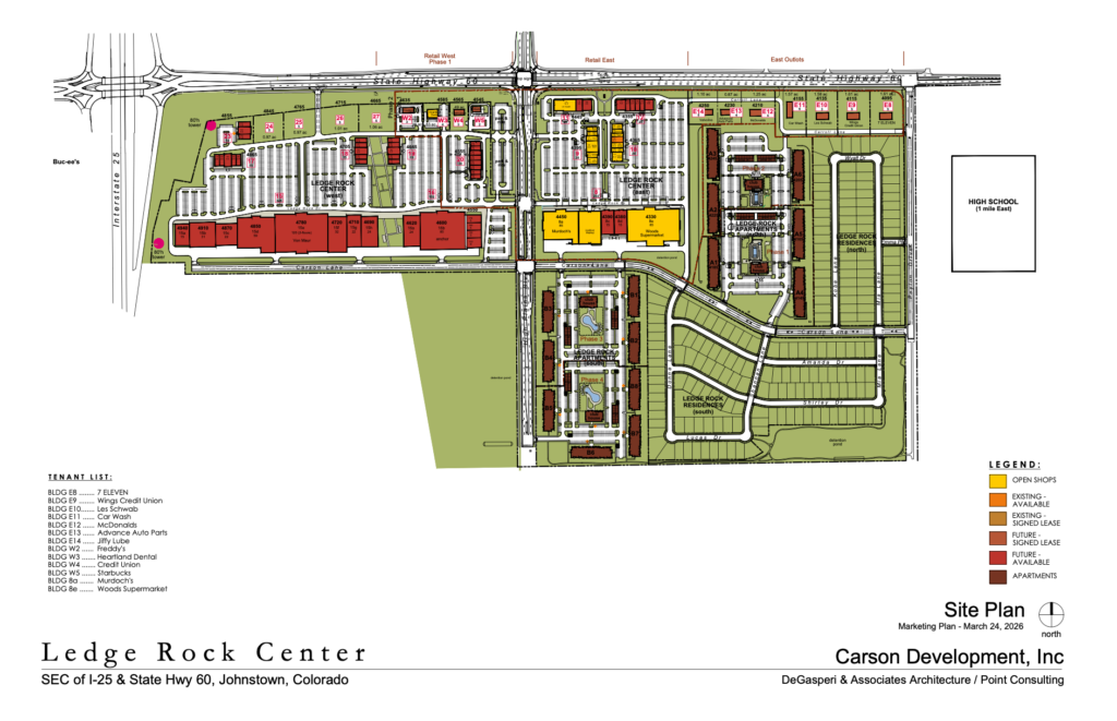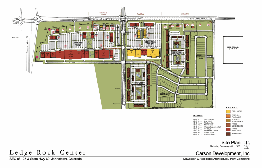 Ledge Rock is a 200 acres, mixed-use, master planned community in Johnstown, Colorado. A complete community located on the southeast side of I-25 and state highway 60, it will contain 1200 new apartments, 160 new single residences, and over 1-million square feet of retail space. In addition, there are 3 new state-of-the-art schools and 3200 new residents within 2 miles. Ledge Rock Center, the retail development is now pre-leasing. Call or contact us today to be a part of this exciting new opportunity.